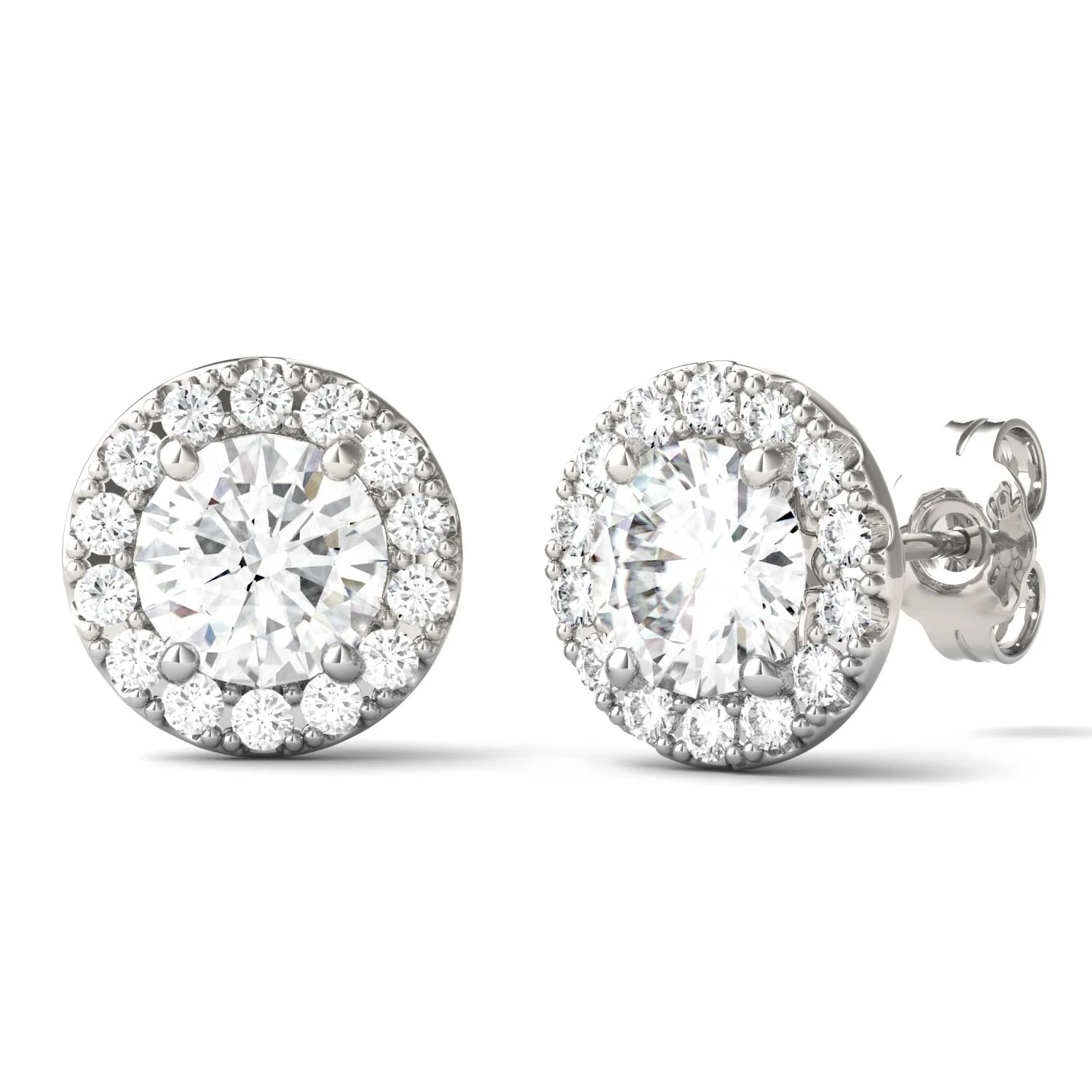 These stunning 14K white gold moissanite halo stud earrings feature a traditional friction back post and are a must-have addition to your wardrobe. Each stud has a diamond equivalent weight of 1.01 CTW.