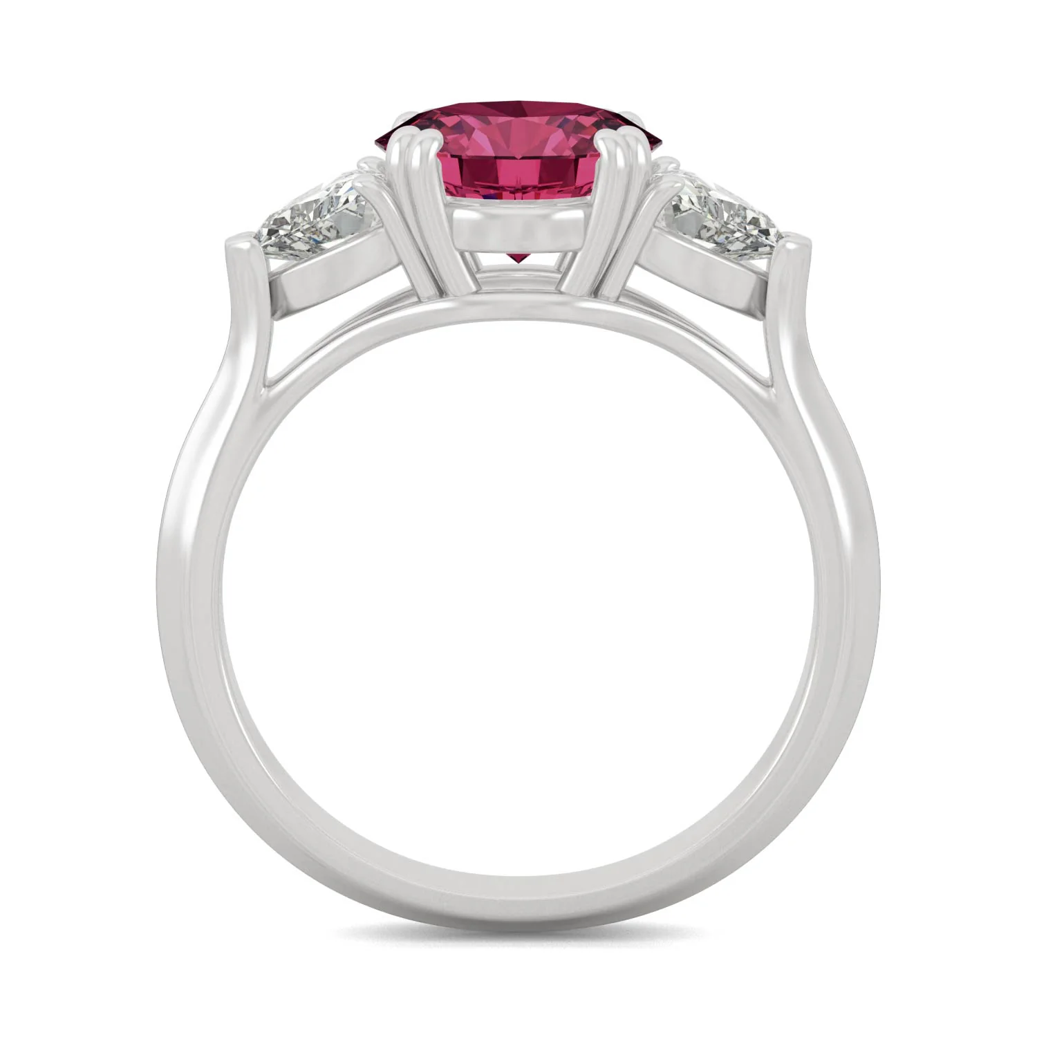 Behold the bold beauty of a brilliant round ruby beaming at the center of this ring. Flanked by trillion-cut side stones that amplify the chic shine. Equally stunning as an engagement ring or a right hand ring.